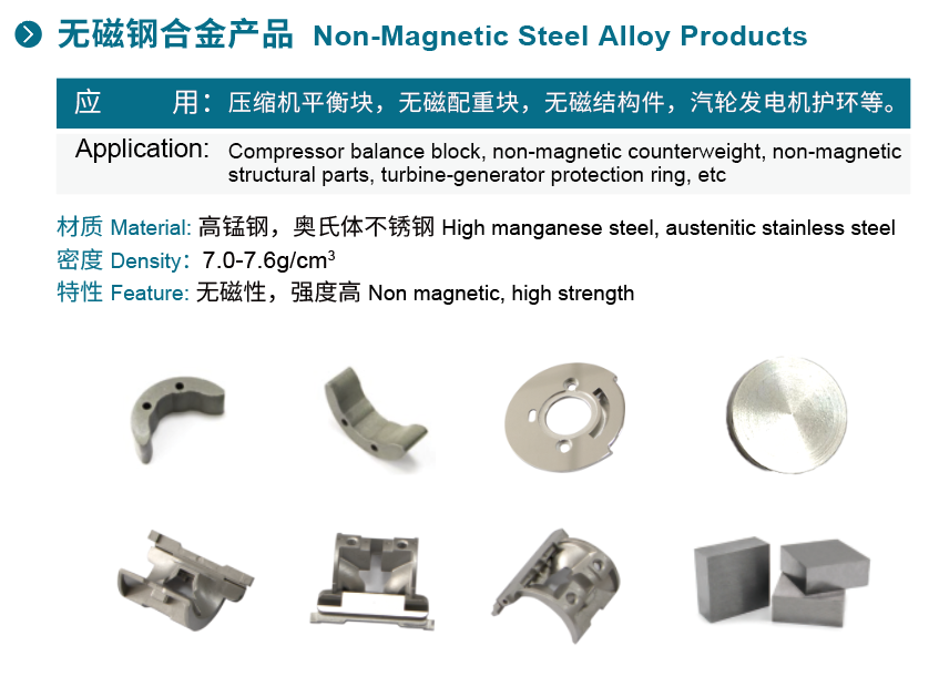 ◆ 应用:压缩机平衡块、无磁配重块、无磁结构件、汽轮发电机护环等
