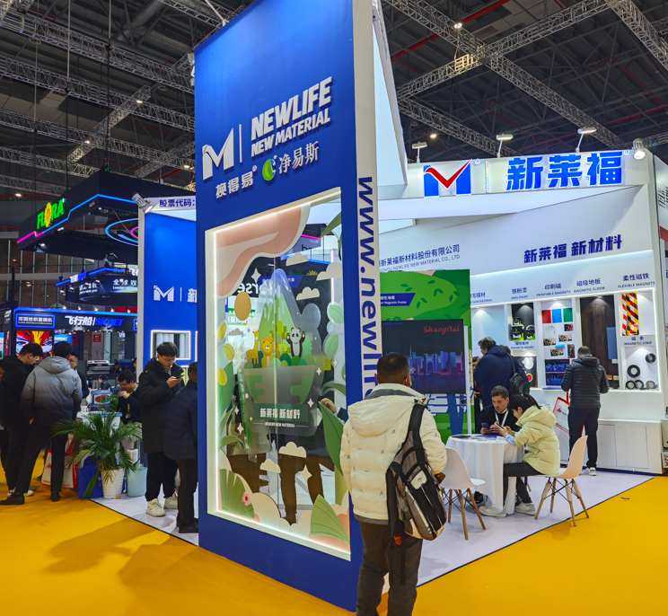 新莱福展示了一系列全新铁粉膜系列、印刷磁系列、可擦写膜系列、净易斯系列、磁吸墙纸系列、磁吸地板系列以及铁粉漆产品的使用场景以及解决方案